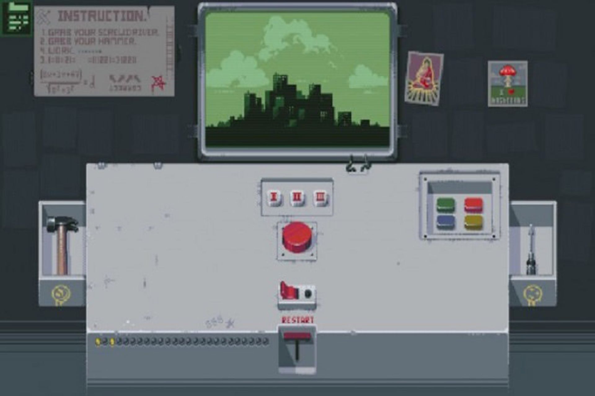 در فضای دوبعدی ابتدای بازی شما در یک اتاق قرار دارید و در مقابل شما یک پنل به همراه یک دکمهی قرمز رنگ بزرگ قرار دارد و دقیقا روبروی شما یک مانیتور قرار داده شده است تا بتوانید تصویری از شهر را را ببینید. این دکمهی قرمز هرلحظه شما را به سمت خود جلب میکند و شما را وسوسه میکند تا آن را فشار دهید.
