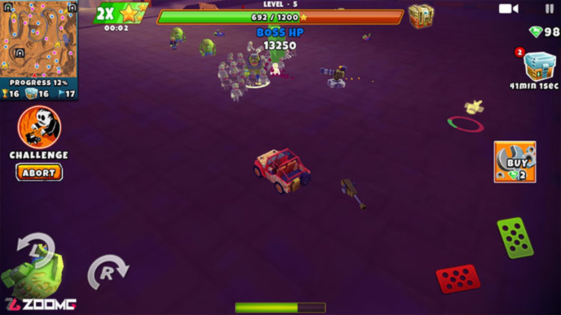 ماموریتهای بازی هم متنوع هستند. در نقشه، نقاطی آبی رنگ قرار دارد که باید با ورود به آنها ماموریت را آغاز کنید. در حالی که گاهی ماموریت شما تنها رسیدن از نقطهای به نقطهی دیگر است، در برخی ماموریتها نیز باید با باس قدرتمندی مبارزه کنید که زامبیهایی با ظاهر مومیایی احضار میکند. برخی چالشهای کوچک هم در بازی وجود دارند که برای افزایش دادن سطح، کاربردی هستند. البته ویژگیهای بازی به اینجا ختم نمیشود و شما قادر به خریداری خودروهای متنوع، از خودروی پلیس گرفته تا آتشنشانی و تانک، هستید. هر وسیلهی نقلیه مقاومت متفاوتی دارد و به ویژه برای حملهی سنگین زامبیها باید بعد از مدتی به فکر خرید یکی از این وسایل نقلیه بیفتید. هرچند خریدهای درون برنامهای کار را برای آزادسازی وسایل نقلیه آسان میکنند، اما با برداشتن صندوقهای مخفی در نقشه نیز فرصتی عالی را برای جمع کردن قطعات خودروها به دست میآورید.