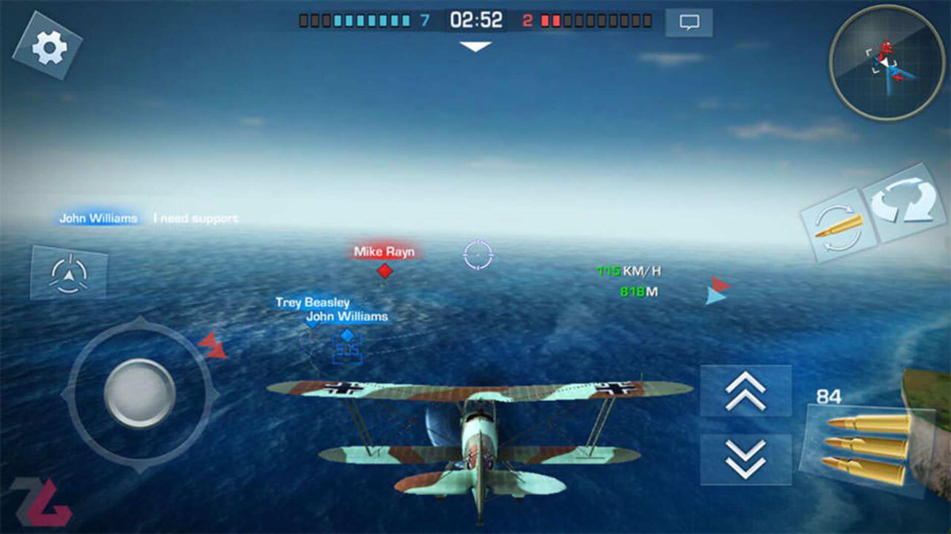 اما عاملی که در بازی اهمیت زیادی دارد، گیمپلی و نحوه کنترل هواپیما است؛ چرا که در واقع سبک بازی به شکلی است که حتی بازی کردن آن با کنترلر هم کار سختی به نظر میرسد، چه برسد به کنترلرهای لمسی گوشیهای موبایل. با این حال استودیو مینیکلیپ موفق شده کنترلر سادهای را برای بازی تعبیه کند که تجربه آن را به کار لذتبخشی تبدیل میکند. کنترل بازی به این شکل است که با یک جویاستیک در سمت چپ صفحه، حرکت هواپیما کنترل میشود و با کلیدهای سمت راست هم میتوانید سرعت هواپیما را افزایش یا کاهش دهید یا به سمت هواپیماهای دشمن شلیک کنید. به مرور زمان و با به دست آوردن منابع با پیروزی در نبردها، میتوانید هواپیمای خودتان را ارتقا دهید و آن را به سلاحهای بهتری مجهز کنید یا کلا سراغ خرید هواپیمایی جدید بروید و از مبارزه با تجهیزات بهتر، لذت ببرید.
