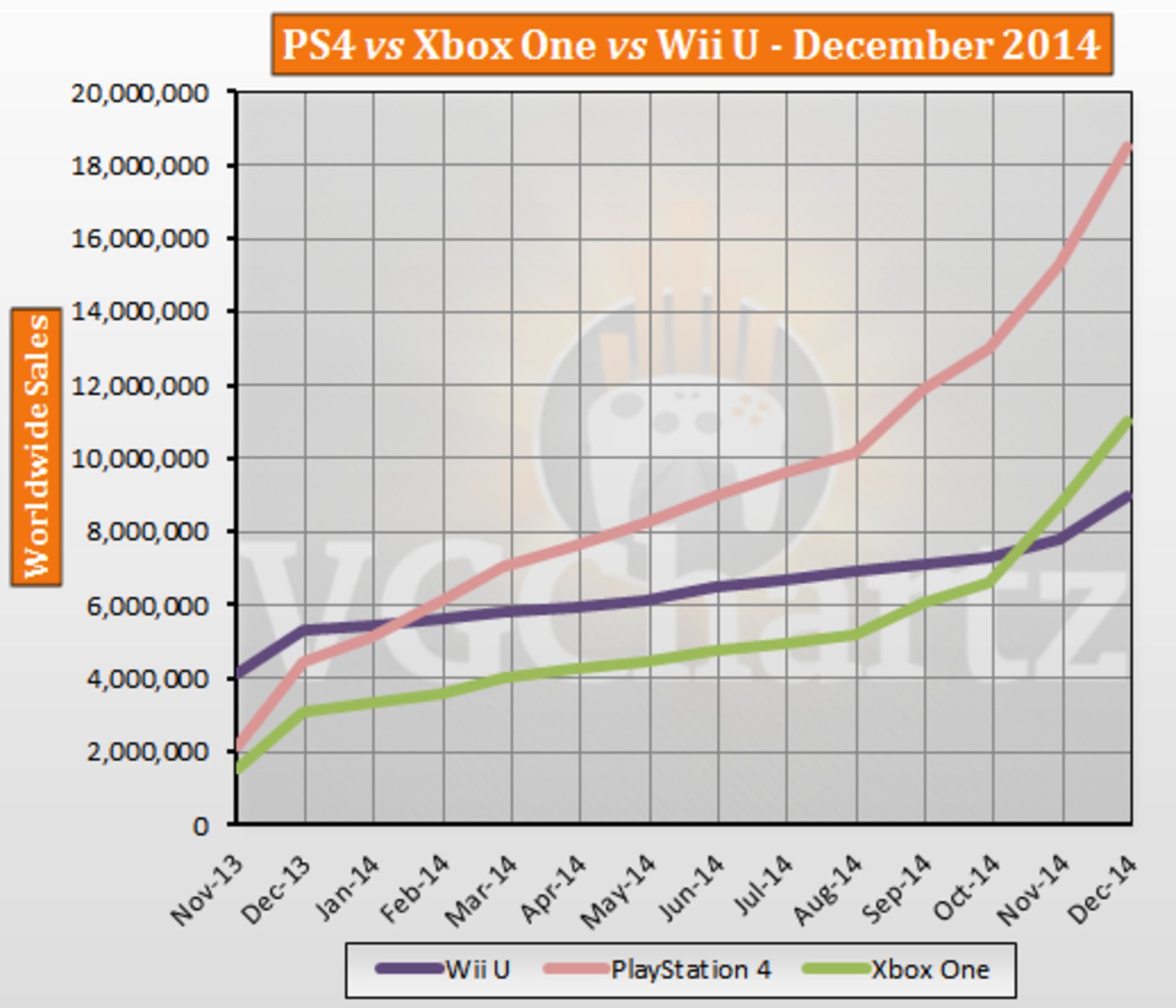 این نمودار که مربوط به فروش کلی این کنسولها از نوامبر ۲۰۱۳ تا دسامبر ۲۰۱۴ در تمامی نقاط جهان است، نکتهای که باید به آن توجه کرد این است که آمارهای فروش ماههای منتهای به کریسمس و جمعه سیاه همه مربوط به کشور آمریکا بودهاند. همانطور که در نمودار هم مشخص است پلیاستیتشن 4 توانسته با شیبی مناسب برتری خود در زمینه فروش را حفظ کند. همچنین کاهش قیمت ایکسباکس وان هم به افزایش فروش این کنسول کمک شایانی کرده است. پلیاستیتشن 4 با عبور از عدد ۱۸ میلیون، ایکسباکس وان با عبور از عدد ۱۰ میلیون و نینتندو WiiU هم با عبور از ۸ میلیون توانستهاند فروشی معادل اعداد زیر داشته باشند: