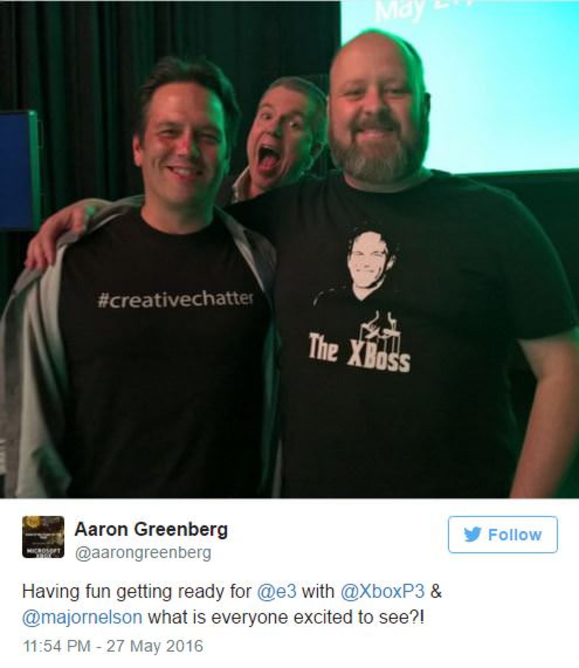 آرون گرینبرگ، رئیس بخش بازاریابی ایکسباکس، تصویری از خودش، اسپنسر و لری هرب (میجر نلسون) در توییتر منتشر کرده که میتوانید آن را در بالا مشاهده کنید و تیشرتهای جالب او و اسپنسر را ببینید. تیشرت فیل اسپنسر ظاهرا توسط Ken Birge تهیه شده است.