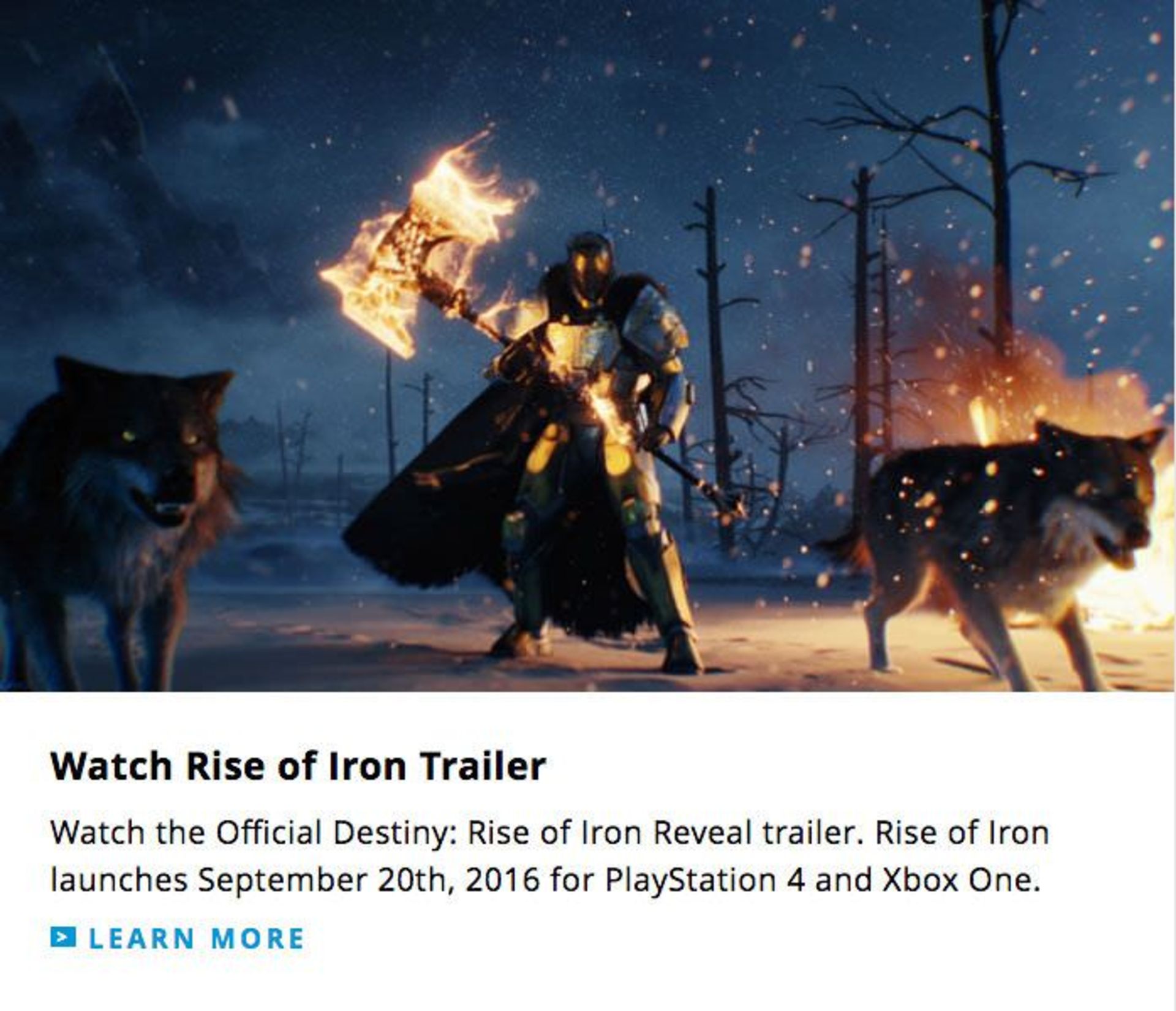 همانطور هم که در تصویر زیر میبینید، در وبسایت رسمی این بازی، قسمتی تحت عنوان «مشاهده تریلر Rise of Iron» وجود دارد که نشان میدهد قرار است بهزودی تریلر این بسته الحاقی منتشر شود؛ استودیو بانجی، توسعه دهنده بازی Destiny، قرار است روز آینده در یک پخش زنده، این تریلر را به نمایش بگذارد.