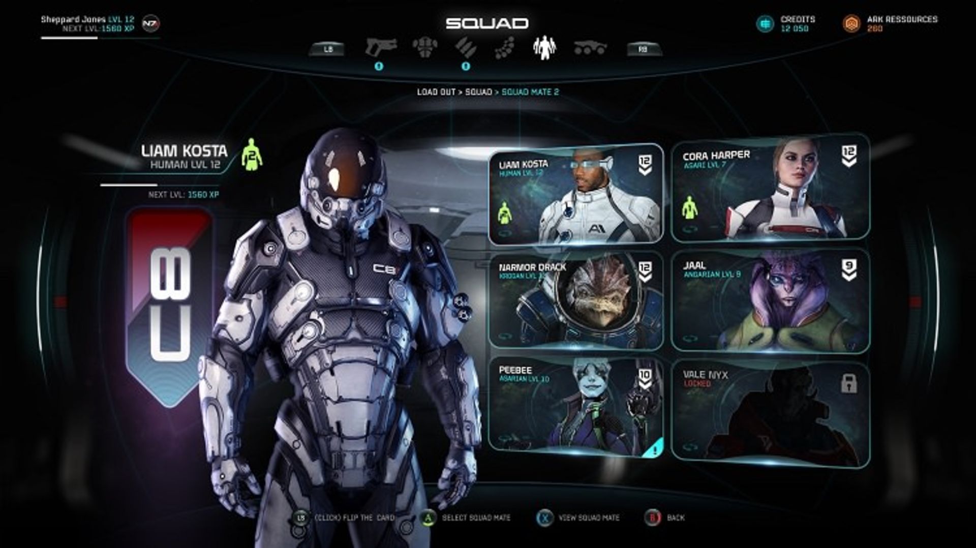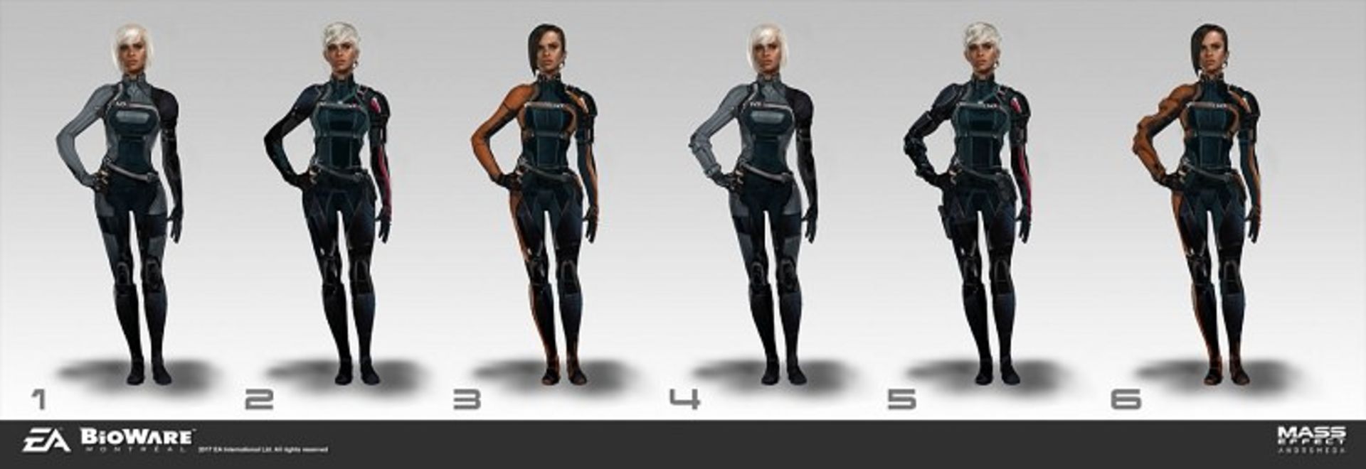 در این تصویر شاهد صفحه اعضای تیم هستیم که مانند نسخه نهایی همان ۶ نفر هستند، با این حال ابتدا قرار بوده که اعضای تیم هفت نفر باشند و نفر هفتم یک سالارین بوده است، اما این تصمیم منتفی شد. همانطور که مشاهده میکنید، ظاهر شخصیتها نسبت به نسخه نهایی کمی متفاوت بوده و به خصوص Cora و Peebee از ظاهر بسیار متفاوتی بهرهمند هستند. چهره Liam شبیه دونالد گلاور بوده و Vetra از نام اولیه خود یعنی Vale Nyx استفاده میکند.