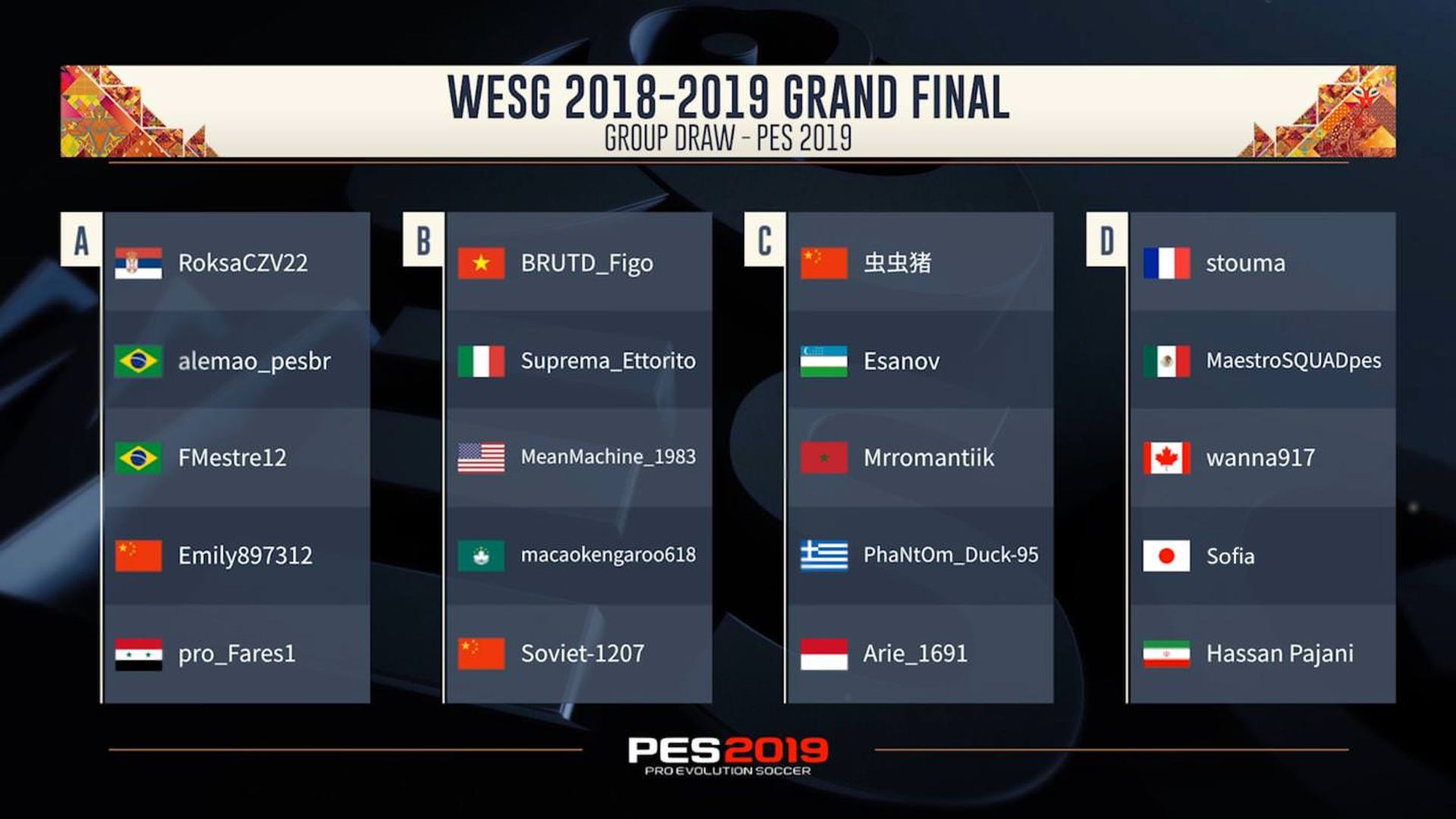 این اولین سالی است که بازی Pro Evolution Soccer در سری مسابقات WESG حضور دارد و ۲۰ بازیکن از سراسر جهان به مرحله اصلی راه پیدا کردهاند. بازیکنان حاضر در مرحله اصلی بایستی در دو مرحله گروهی و حذفی به رقابت بپردازند. بازیهای مرحله گروهی مسابقات به صورت best-of-two برگزار میشود و بازیکنان بایستی برای کسب امتیاز با یکدیگر روبهرو شوند. دو بازیکن برتر هر گروه به مرحله دوم راه پیدا میکنند. مرحله حذفی مسابقات به صورت تک حذفی پیگیری خواهد شد و بازیها نیز با فرمت best-of-three برگزار میشوند.