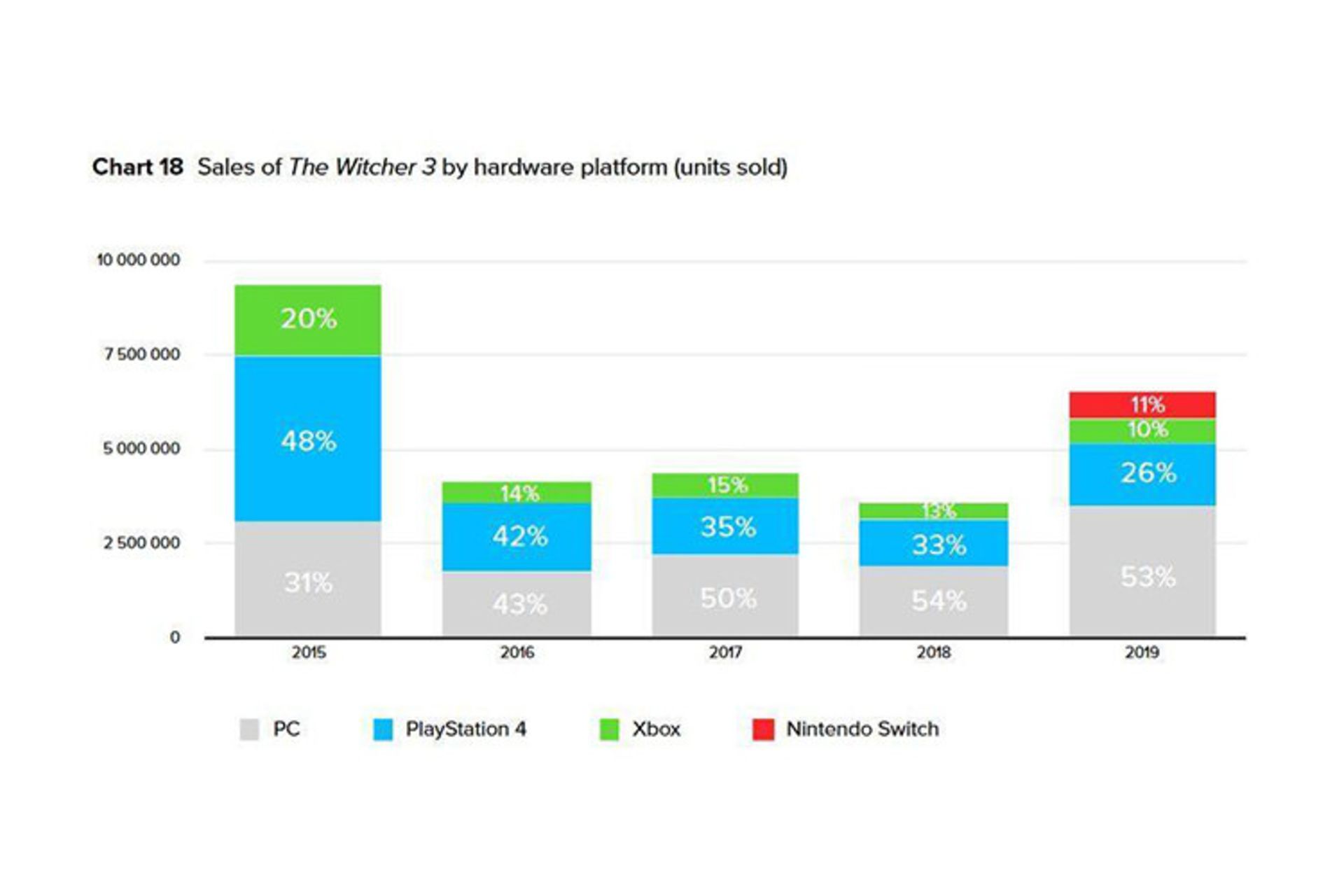 باتوجه به اینکه معمولا استودیوی سی دی پراجکت رد جزییات و اطلاعات ریز و دقیق از میزان فروش را اعلام نمیکند، اما با تلاش یکی از کاربران توییتر و با درنظر گرفتن نمودار منتشر شده، اکنون میتوان اعلام کرد که فروش کلی بازی The Witcher 3 از مرز ۲۸ میلیون نسخه عبور کرده است.