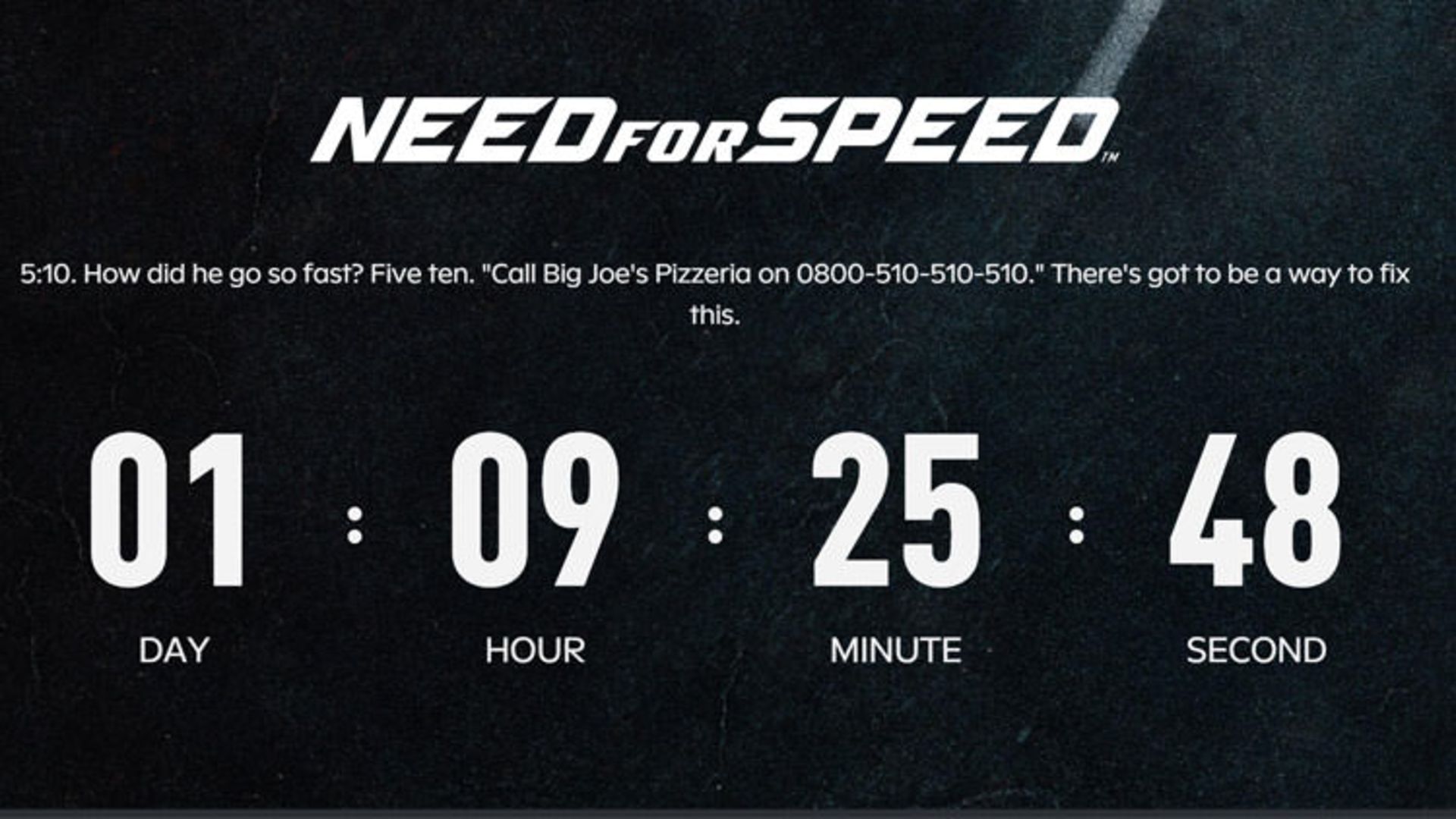 این در حالی است که بهتازگی، وبسایت جدیدی راهاندازی شده که خبر از معرفی نسخه جدید NFS در تاریخ ۱۴ مهر ماه (پنج اکتبر) میدهد. در وبسایت مورد نظر، یک ساعت شمارش معکوس قرار داده شده که به معرفی بازی در بعد از ظهر روز دوشنبه اشاره میکند. از طرفی در این وبسایت هم به عدد ۵۱۰ اشاره شده است.