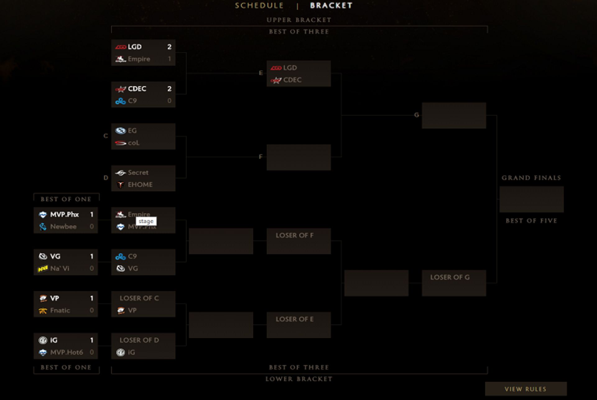 CDEC vs Cloud9دومین سری این براکت بین دو تیم Cloud9 و CDEC برگزار شد. Cloud9 از تیمهای با سابقهی دوتا ۲ است و در طرف مقابل تیم چینی CDEC قرار دارد که حتی به طور مستقیم به مسابقات اینترنشنال دعوت نشده بود و راه خود را از مسیر WildCard پیدا کرد. حالا این تیم جوان توانسته نتایج غیرقابلباور در مرحلهی گروهی کسب کند و باید دید در مرحلهی حذفی چگونه عمل خواهد کرد.در بازی اول تیم CDEC حریف را در هم کوبید و تنها در ۳۰ دقیقه بازی را به پایان رساند. در این بازی شاهد عملکرد فوقالعادهی تیم CDEC به خصوص Xz با هیروی Clockwerk و Shiki با هیروی Lina بودیم. در بازی دوم هم تیم CDEC با اینکه در ابتدای بازی تحت فشار بود توانست بازی را به نفع خود برگرداند و با نتیجهی ۲ بر ۰ برندهی سری شود. در مرحلهی بعد CDEC به مصاف LGD و تیم Cloud9 به براکت پایین خواهد رفت.