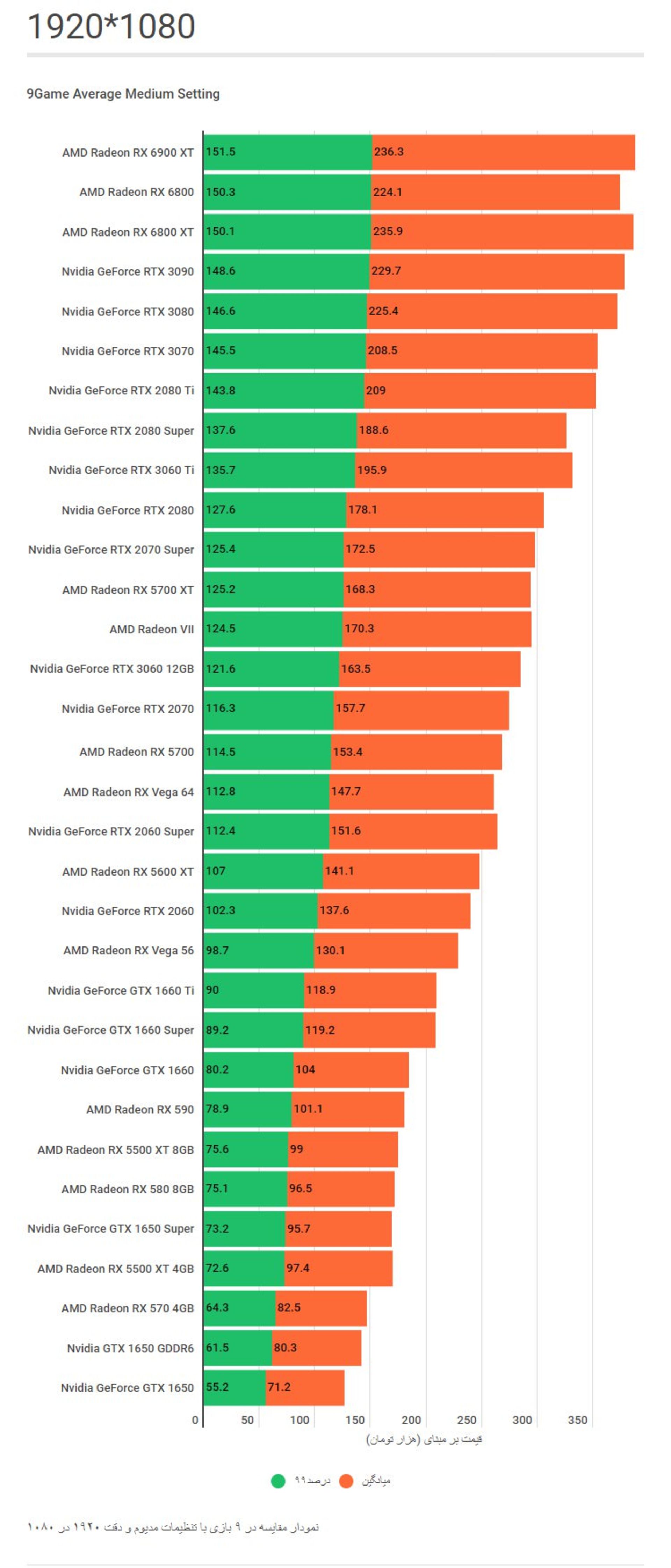 در اینجا شما میتوانید چارتهای راندمان میانگین برای هر سه رزولوشن 1440p ،1080p و 4Kدر تنظیمات Medium و Ultra مشاهده کنید. ما روی جمعبندی نهایی در این چارتها تمرکز میکنیم و از پرداختن به نمودارهای اختصاصی هر بازی صرفنظر کردهایم. همچنین گرافیکهای مجتمع، پردازندههای گرافیکی قدیمی و کارتهای سری تایتان را از این بخش مستثنی کردهایم. به این ترتیب در مجموع ۳۲ کارت گرافیک در چارتها به تفکیک رنگ و دو امتیاز مجزا در مقدار "میانگین نرخ فریم" و "۹۹ درصد نرخ فریم" از مجموع امتیازات کسب شده در ۹ بازی متمایز شدهاند. ۹۹ درصد یا صدک نرخ فریم (99th percentile)، تعریفی است که براساس آن از ۱ درصد بزرگترین نرخ فریمهای بهدست آمده در طول بنچمارک یک بازی صرفنظر شده و عدد بهدست آمده در جایگاه ۹۹ درصد بهعنوان ملاک در نظر گرفته میشود تا معیار واقعبینانهتر و بدون احتساب وقفهها یا Stutter در بنچمارک بهدست آید. به این ترتیب امتیازی که برای معیار ۹۹ درصد بهدست میآید به این معنی است که ۹۹ درصد مواقع نرخ فریم بازی از عدد بهدست آمده بیشتر است. این معیار میتواند جایگزین خوبی برای کمینهی نرخ فریم هم باشد.