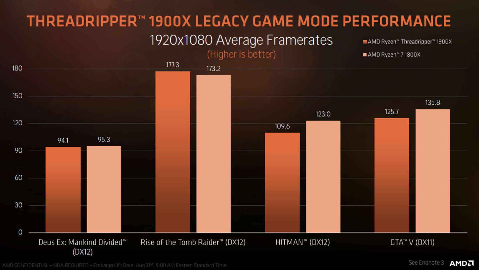 در بنچمارکهایی که توسط خود شرکت AMD و درباره کارایی پردازندههای این شرکت در بازیها منتشر شده میتوان دید که پردازنده 1900X کمی کندتر از 1800X در بازی GTA V، بازی Deus Ex: Mankind Divided و بازی Hitman (با DirectX 12) عمل کرده است. اما در بازی Rise of the Tomb Raider برعکس این وضعیت اتفاق افتاد.