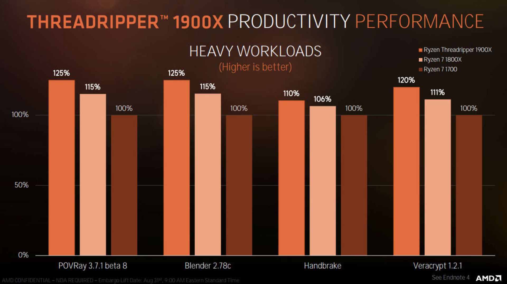 شرکت ای ام دی در حالی پردازنده 1900X را با همتایان قدرتمندش هماهنگ میکرد که این پردازنده ۲۹ تا ۳۹ درصد کندتر از پردازنده ۱۲ هستهای و ۲۴ رشتهای 1920X و همچنین ۵۸ تا ۷۳ درصد کندتر از پردازنده قدرتمند ۱۶ هستهای و ۳۲ رشتهای 1950X بود. این اندازهگیریها در فعالیتهای پردازشی سنگینی که در بالا گفته شد انجام شده است. این مقایسه از ارزش بالای پردازنده 1900X خبر میدهد و همچنین نشان میدهد که معماری Zen که در پردازندههای AMD به کار رفته است دارای قدرت ارتقای بسیار خوبی است که ارتقای هرچه بیشتر این پردازندهها را در آینده در پی خواهد داشت. با افزایش تعداد هسته و رشتههای پردازشی مستقیما شاهد افزایش کارایی در این پردازندهها هستیم.