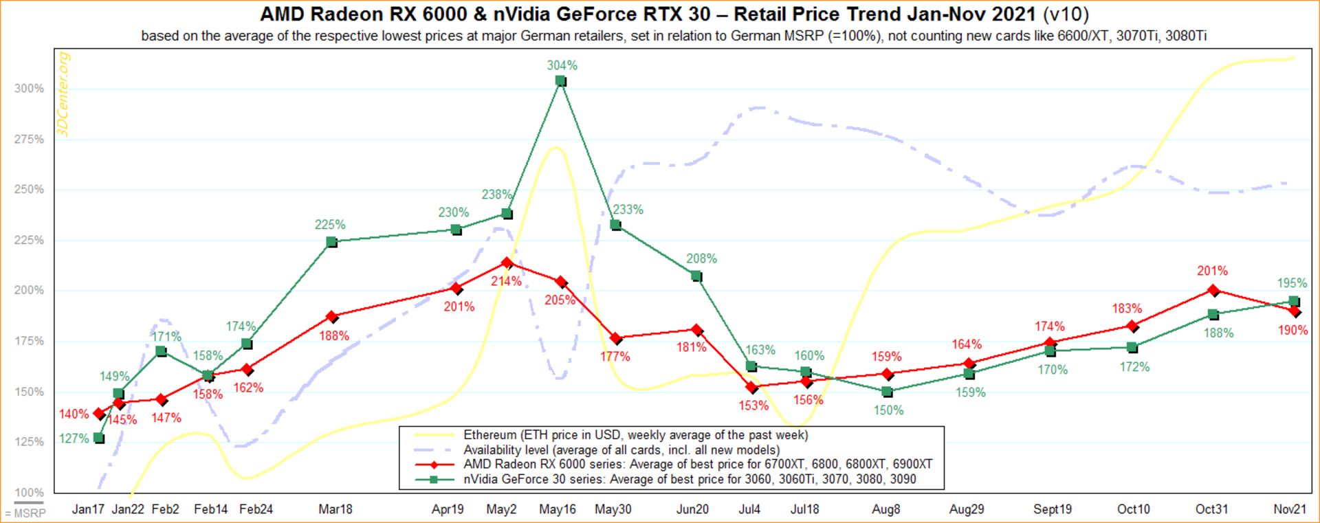ازطرفی کارت گرافیک سری NVIDIA GeForce RTX 30 در کشورهای اروپایی بهطور متوسط ۹۵ درصد گرانتر از قیمت واقعی خود به فروش میرسند که برای اولینبار از ماه ژوئیه، بالاتر از سطح قیمت متوسط محصولات سری Radeon RDNA2 محسوب میشود. بهطور مثال، کارت گرافیک RTX 3080 در حال حاضر با ۱۵۰۰ یورو قابل خریداری است که بیش از دو برابر قیمت مصوب ۷۱۹ یورویی این کارت به شمار میرود.