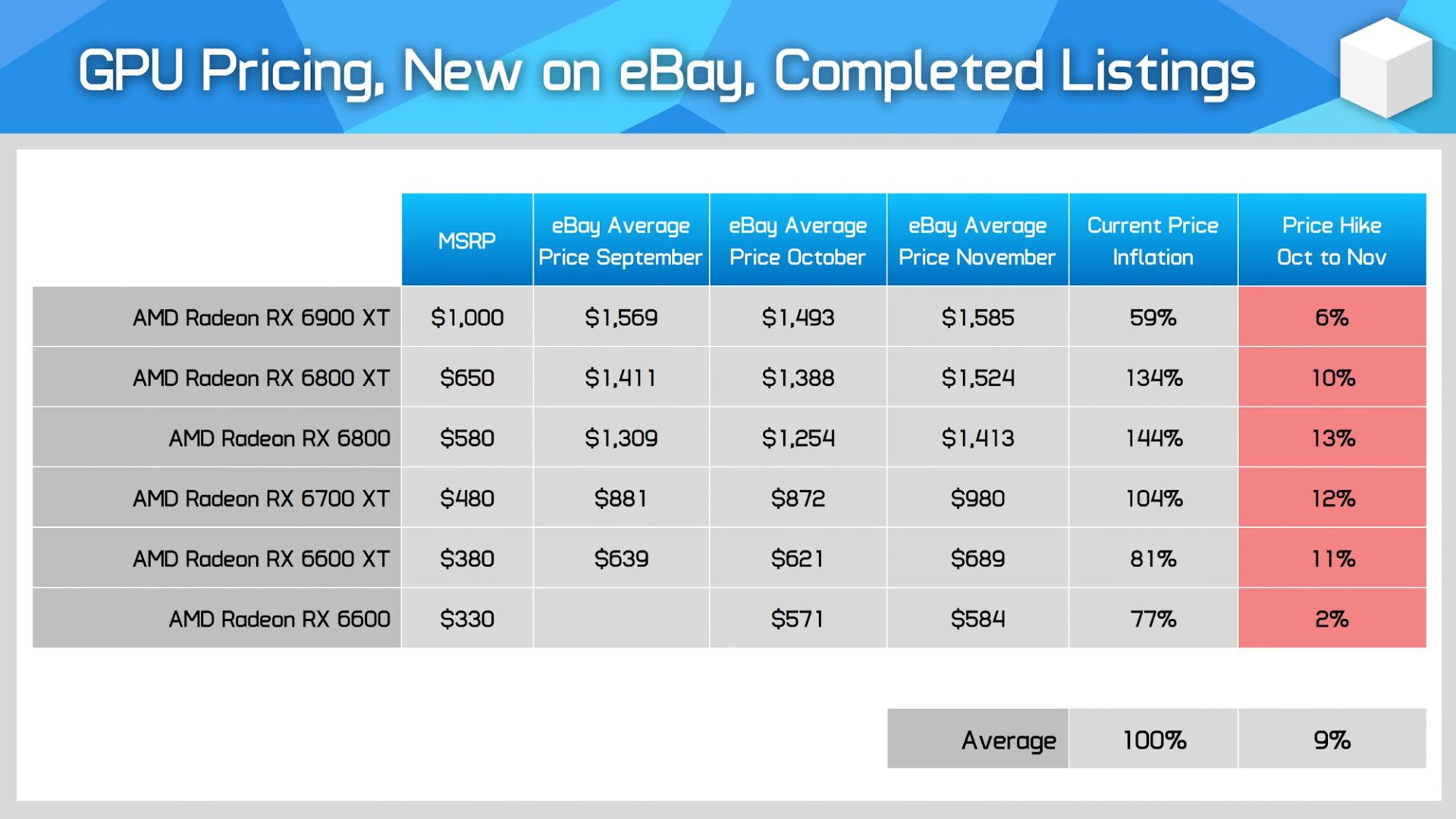 قیمت محصولات سری AMD RX 6000 نیز تعریف چندانی ندارد. بهطور متوسط قیمت کارت گرافیکهای AMD نسبت به ماه قبل ۹ درصد افزایش یافته تا حالا به مرز ۲ برابر گرانتر از قیمت مصوب برسند.