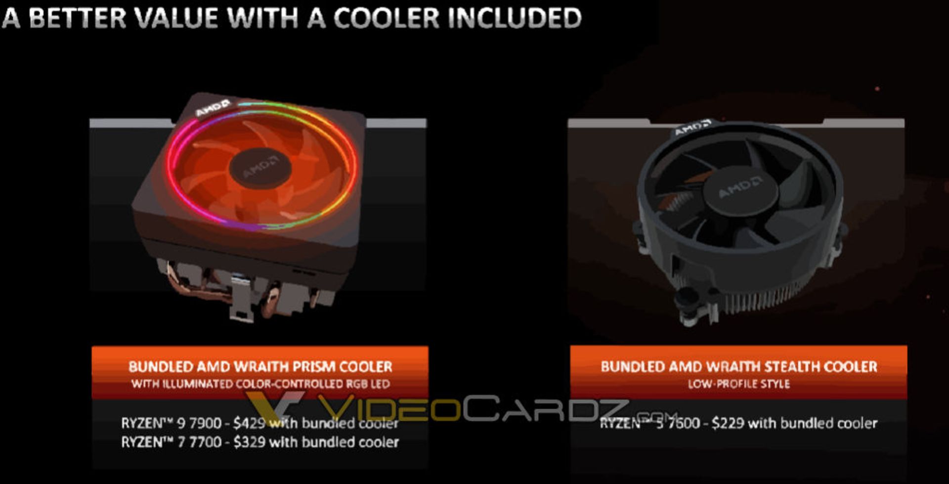 از آنجایی که کولرهای AM4 رسما با سوکتهای AM5 سازگار هستند، خنککنندههای فعلی AMD نیز برای تراشههای سری Ryzen 7000 میتوانند مورد استفاده قرار بگیرند. پردازندههای ۶۵ واتی این سری با این کولرها که Wraith Prism و Wraith Stealth نام دارند، باندل خواهند شد.