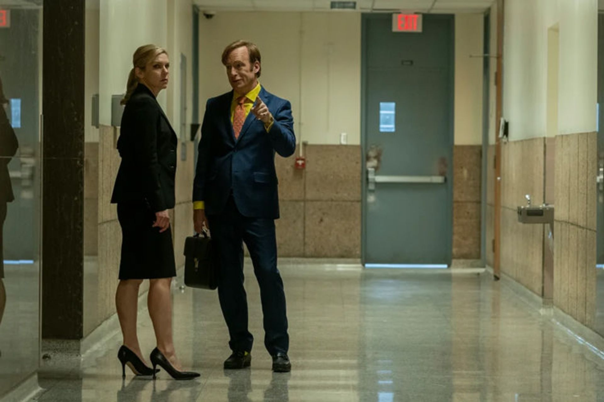 اما نکته این است که اگر جیمی در طولِ چهار فصلِ گذشته، یک مهارت آموخته باشد، آن چیزی نیست جز: هنرِ تبدیل کردنِ مشکلش به مشکلِ دیگران. بنابراین وقتی هردوی آنها در آسانسوری که طبقِ برنامهریزی قبلی جیمی با مسئولِ آسانسور، بینِ طبقاتِ گیر میکنند، اِریکسون چارهای به جز استفاده از وقتِ بلااستفادهاش برای حلوفصل کردنِ پروندههای مشترکش با جیمی ندارد. اما در حالی جیمی مثل آب خوردن درگیریهای شغلیاش را درست و راستی میکند، متقاعد کردنِ کیم به همان آسانی نیست. کیم تنها کسی است که از معنای واقعی تغییرِ اسم جیمی خبر دارد و بهعنوانِ کسی که از طرفِ روشنِ جیمی آگاه است، بهتر از دیگران متوجهی فتحِ این روشنایی توسط طرفِ تاریکش میشود. بنابراین جیمی، کیم را برای دیدن از خانهای شگفتانگیز برای خریدن میبرد؛ کیم با اکراه قبول میکند؛ این حرکتِ آشنایی است. او یکبار در فصل چهارم تلاش کرده بود با اجاره کردنِ یک دفترِ گرانقیمت در یک آسمانخراش در مرکز شهر، کیم را برای کار کردن با او تحتتاثیر قرار بدهد. شکافِ بینشان به وضوع قابلتشخیص است و سردی رابطهشان احساس میشود، اما همین که آنها در این خانهی درندشت پرسه میزنند، دربارهی تبدیل کردن اتاقِ پذیرایی وسیعش به سینمای خانگی گمانهزنی میکنند، با دیدنِ کمدِ لباسِ بزرگِ خانه کف و خون قاطی میکنند و دربارهی آیندهی مشترکشان خیالپردازی میکنند، گرمای بنیادینِ رابطهشان شروع به آب کردن یخی که بعد از ماجراهای تغییرِ اسم جیمی بینشان شکل گرفته بود میکند. اینکه کیم، شیرِ دوشِ حمام را روی جیمی باز میکند به این معنی نیست که تمام مشکلاتش حل شده است، اما حداقل به این معنی است که نهتنها کیم هنوز جیمی را با وجود تمام ایراداتش دوست دارد، بلکه جیمی هنوز آنقدر به کیم اهمیت میدهد که برای به دست آوردنِ دوبارهی دلش تلاش میکند؛ تلاشی که برخلافِ حقهبازیهایی که در راهروهای دادگاه اجرا میکند، صادقانه است. با این وجود، نمیتوانستم جلوی خودم را بگیرم و در تمام طولِ سکانسِ خانهگردی اضطراب نداشته باشم. چرا که این سکانس یادآورِ سکانسِ شومِ مشابهای از «بریکینگ بد» است؛ اپیزودِ سیزدهمِ فصل سومِ سریال اصلی با فلشبکی به حدود ۱۶ سال پیش از اتفاقاتِ زمان حال آغاز میشود. جایی که نسخهی جوانتر والت و اسکایلر (که والتر جونیور را باردار است) مشغولِ دیدن از خانهای که در آینده در آن زندگی خواهند کرد هستند. آنها درست مثلِ جیمی و کیم دربارهی آیندهشان خیالپردازی میکنند؛ والت از اینکه آیندهی روشنی با سه بچه در این خانه خواهند داشت میگوید و از این نگران است که نکند این خانه در حدِ بلندپروازیهایشان نباشد: «ما به جز بالا، جای دیگهای برای رفتن نداریم».