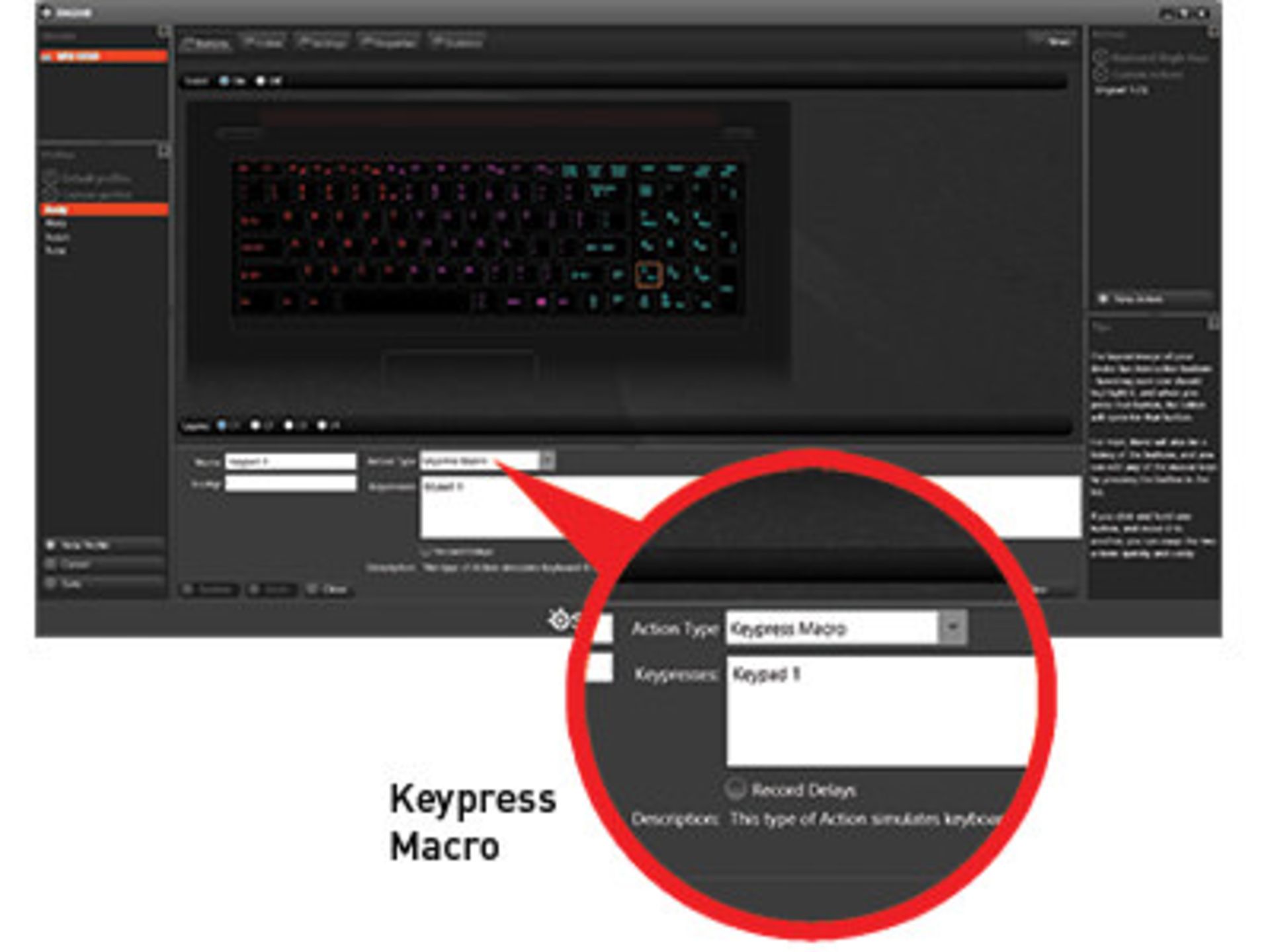 علاوه بر این، شما میتوانید صفحه کلید خود را طوری تنظیم کنید که با فشردن هر کلید، برنامه دلخواهتان اجرا شود و دیگر برای اجرای برنامهها، نیازی به ماوس ندارید! با استفاده از برنامه SteelSeries Engine، شما میتوانید ماکروهای بیشماری را برای صفحه کلید خود تعریف کنید. شما حتی میتوانید کارهایی که با ماوس انجام میدهید را در ماکروها تعریف کنید. ماکروها طوری تنظیم شدهاند که با بازیهای شما تداخلی نداشته باشند. KLM یا سیستم مدیریت نورپردازی کیبورد، به شما اجازه میدهد که از بین هزار ترکیب مختلف، رنگ صفحه کلید خود را تنظیم کنید.